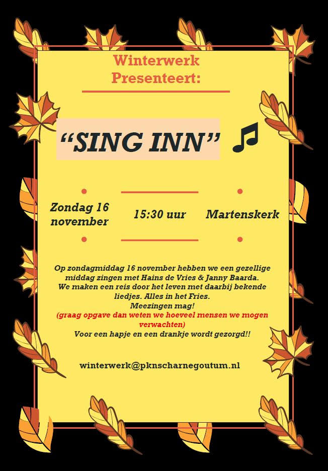 Op zondag 16 november a.s. Samen luisteren en zingen met sjongeres Janny Baarda mei op de toetsen Hains de Vries. We starten om 15.30 uur, locatie Martenskerk. Voor een hapje en een drankje wordt gezorgd. Graag opgeven i.v.m de catering bij winterwerk@pknscharnegoutum.nl ![]() |